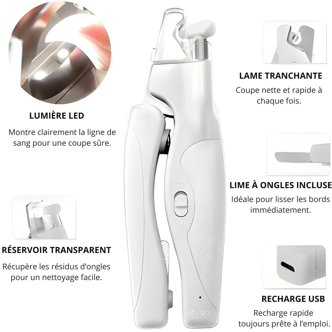 Grâce à sa lumière LED intégrée, vous voyez clairement la pulpe de l’ongle pour éviter toute blessure.